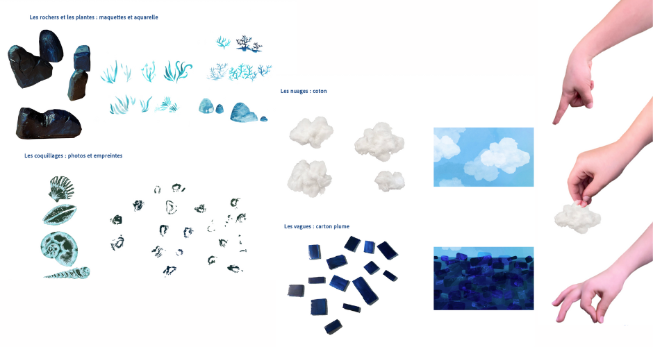 Dans cette direction artistique, Emma a fait le choix de ne prendre que des techniques de création utilisées par les enfants (collages, maquettes, tampons, peinture...). Une fois la totalité des éléments récoltés, Emma les a assemblé sur Photoshop et y a ajouté des lumières d'ambiance. L'objectif de ce choix artistique : laisser penser au spectateur qu'une petite fille se cache derrière la réalisation de ce court-métrage.