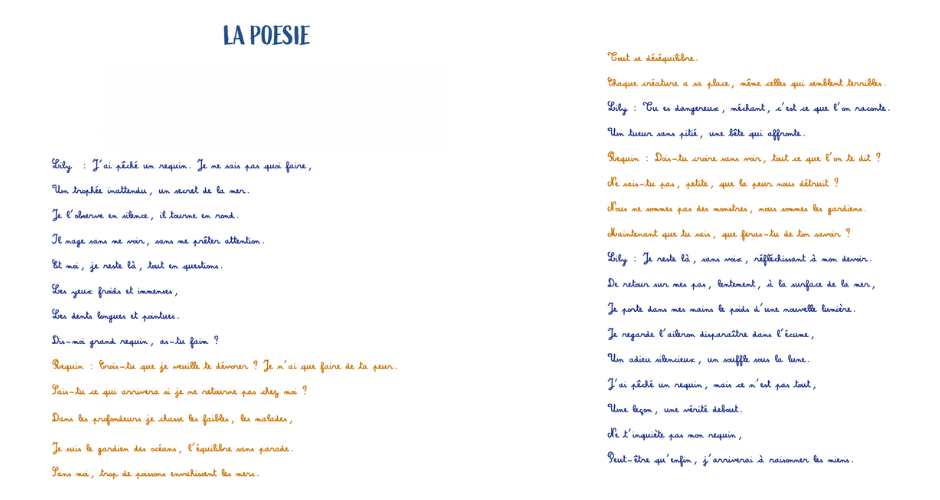 En ce qui concerne la voix-off de la poésie, nous allons retrouver une voix grave pour le requin, qui vient se positionner en contraste avec la douce voix de Lily. Emma a fait le choix de placer une voix d'enfant plutôt que celle d'une comédienne, une manière d'apporter plus de sensibilité à son oeuvre.